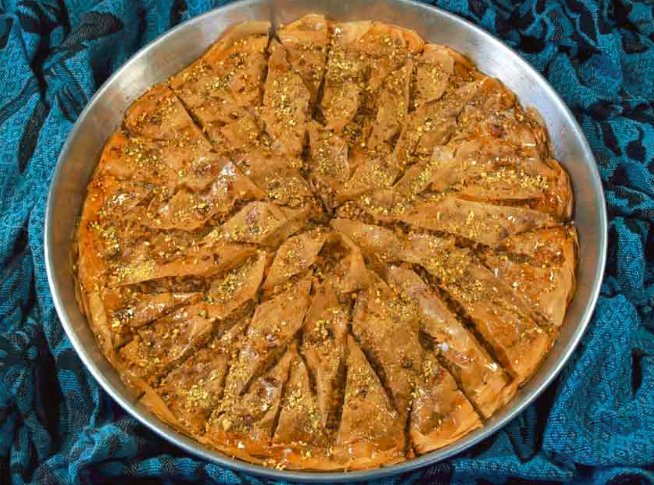 Für das Baklava werden die Filoteig-Platten übereinander geschichtet und einzeln mit flüssiger Butter bestrichen. Zwischen die Teigplatten streuen wir die gehackten Walnüsse. Das Baklava wird vor dem Backen ins Stücke geschnitten und mit Butter übergossen. Nach dem Backen tränkt man das heiße Baklava mit Zuckersirup. Der Sirup wird mit etwas Honig und Zitronen aromatisiert. Zuletzt wird das Baklava mit gehackten Pistazien verziert.