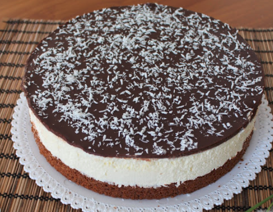 Schokomasse über die Torte gießen. Torte etwas kühlen, dann mit Kokosflocken bestreuen.