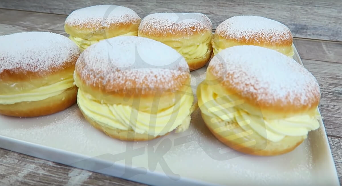- Diese wird in einen Spritzbeutel mit Sterntülle gefüllt und auf die Böden der Berliner gespritzt. Dann kommen die Deckel drauf und werden mit Puderzucker bestäubt.