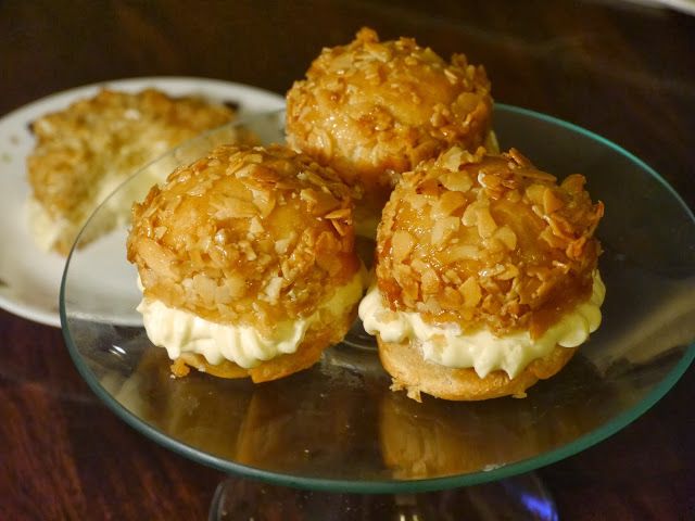 Die Bienenstich-Muffins aus dem Backofen nehmen und die Kruste noch einmal auf den Muffins verteilen,dann vollständig auskühlen lassen und quer halbieren.