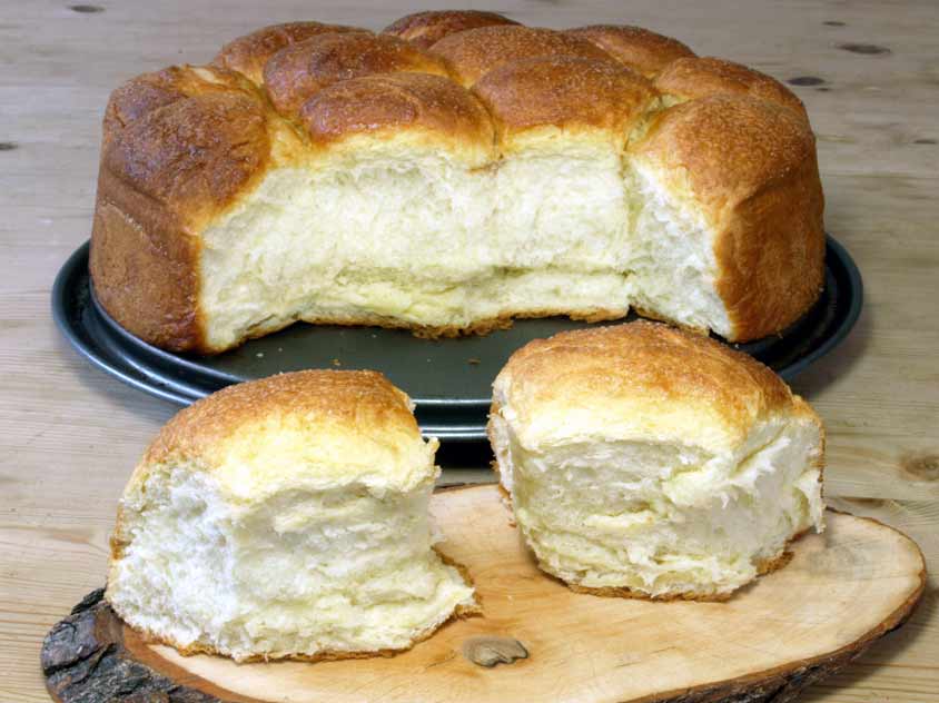 Nun den Buchteln-Teig nochmals kurz mit dem Handrührgerät durchkneten. Dann den Teig mit etwas Mehl auf der Arbeitsfläche zu einer Rolle formen, und die Rolle in 13 gleich große Teigstücke schneiden. Die Buchteln zwischen den Handflächen rund formen. Vier Buchteln in die Mitte der gefetteten Springform oder der Auflaufform legen, und die restlichen Buchteln außen herum verteilen. Dann die Buchteln mit einem Esslöffel flüssiger, aber nicht heißer Butter bestreichen. Nun die Buchteln nochmals abgedeckt etwa 30 bis 45 Minuten gehen lassen.