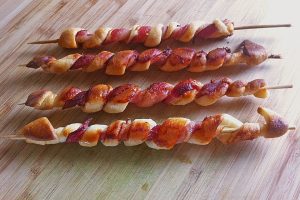 Zutaten 1 Paket Pizzateig 200 g Rindfleisch, in dünnen Scheiben 100 ml Olivenöl oder Sonnenblumenöl 1 Zweig/e Rosmarin 1 Zehe/n Knoblauch Öl zum Fetten der Spieße Zubereitung Die Knoblauchzehe …