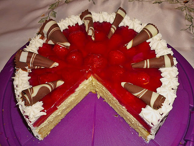 Die gewaschenen und entstielten Erdbeeren (große sollten halbiert werden) auf der Vanillecreme verteilen. Den Tortenguss nach Packungsanweisung mit dem Wasser anrühren, kochen und anschließend über den Erdbeeren verteilen. Fest werden lassen und dann ist der Kuchen servierfertig