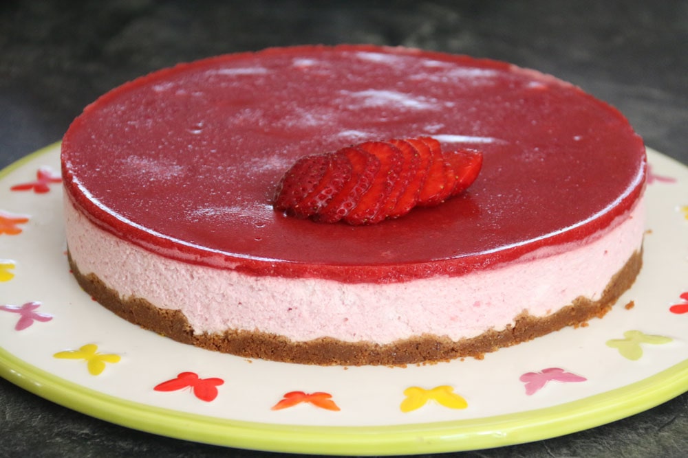 Erdbeeren putzen und pürieren. Zucker dazugeben und das Ganze bei milder Hitze erwärmen, bis sich der Zucker aufgelöst hat. Gelatine nach Packungsanleitung einweichen und dann mit dem Erdbeerpüree vermengen. Das Püree etwas abkühlen lassen und dann vorsichtig auf die weiße Creme geben. Die Torte über Nacht kalt stellen und am Folgetag servieren. Guten Appetit!