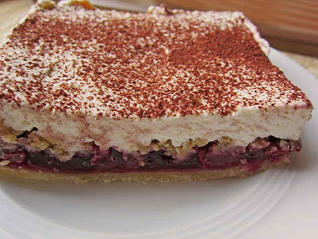 Aus Mehl, Butter, Zucker, Ei einen Mürbteig herstellen, ausrollen und in eine gefettete Kuchenform mit 28cm Durchmesser legen. Die Sauerkirschen darauf verteilen.