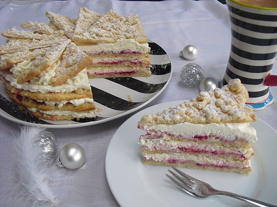 Für den Teig wird aus den genannten Zutaten ein Mürbeteig erstellt. In vier Teile teilen und auf Springformböden verteilen. Die Streusel auf die vier Böden verteilen und dann bei 200° ca. 15 Minuten backen. Nach dem Backen sofort lösen und erkalten lassen.