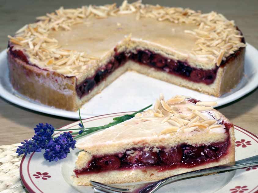 Den Gedeckten Kirschkuchen mach dem Backen abkühlen lassen und aus der Springform nehmen. Aus Puderzucker und Wasser einen Zuckerguss anrühren und damit den Gedeckten Kirschkuchen mit einem Backpinsel oben und am Rand einstreichen. Dann die gerösteten Mandelstiften auf den noch flüssigen Zuckerguss streuen.