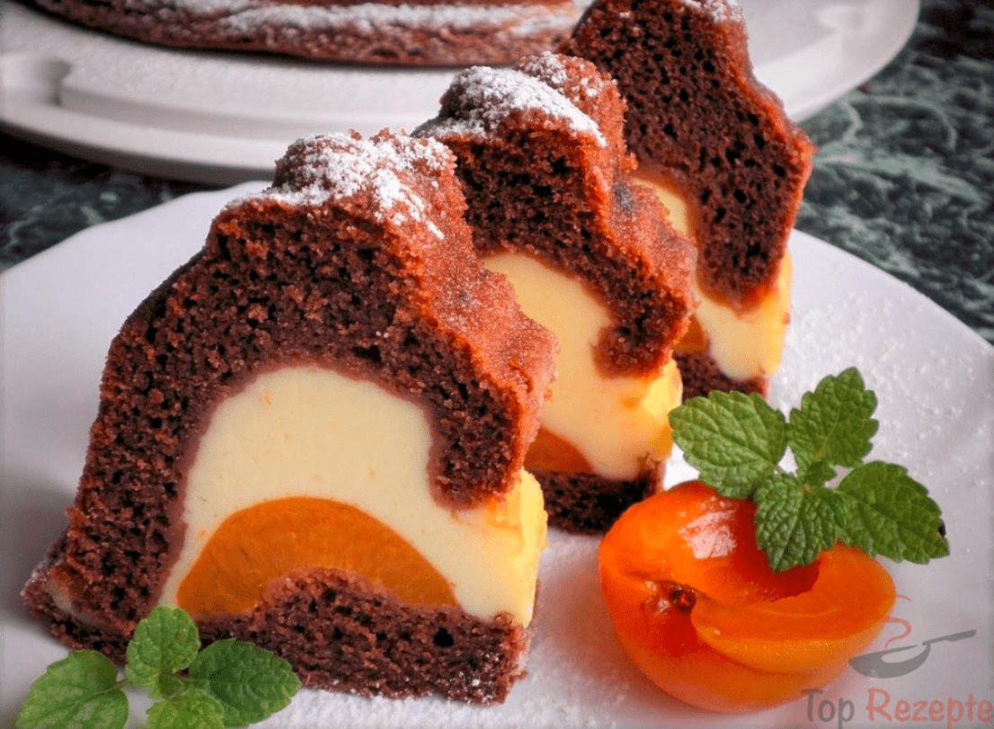 – Eine Hälfte des Teiges in eine gefettete und bemehlte Gugelhupfform geben. Die Quarkfüllung darüber verteilen, mit abgetropften Aprikosenhälften belegen und mit dem Rest des Teigs zudecken.