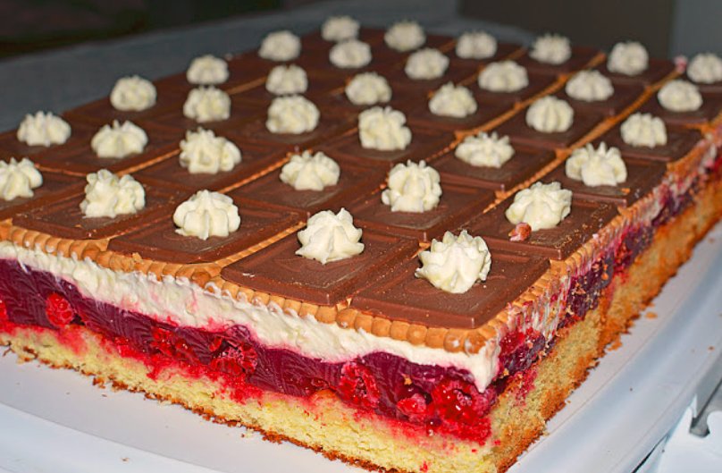 Das Himbeerkompott auf den abgekühlten Kuchenboden streichen. Die Sahne-Puddingcreme darübergeben und glatt streichen. Die Kuvertüre im heißen Wasserbad schmelzen und jeden einzelnen Keks damit bestreichen-trocknen lassen. Die Platte mit den 28 Butterkeksen belegen und mindestens 4 Std. kühlen.