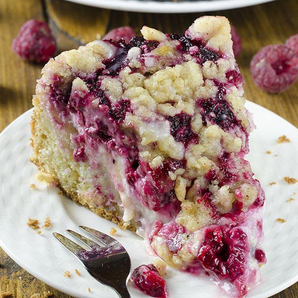 Die Kuchenoberfläche mit Kokosraspel bestreuen und mit den Himbeeren verzieren.