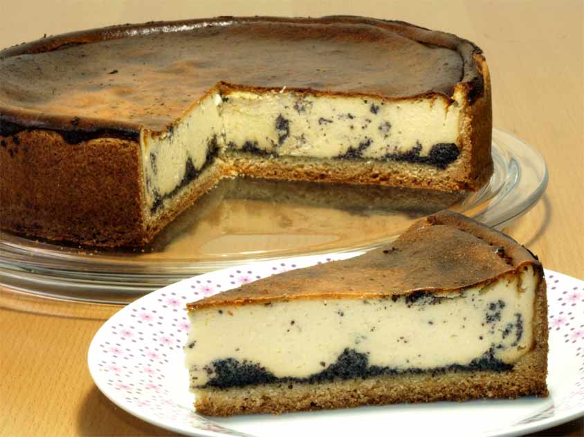 Für dieses Mohn-Käsekuchen Rezept wird ein Mürbeteig geknetet. Die Käsekuchen-Masse wird mit heißer Milch zubereitet, dadurch verkürzt sich die Backzeit ein wenig. Die Mohnfüllung aus einer fertigen Mohnzubereitung wird auf dem Mürbeteigboden verteilt, und darauf die Käsekuchen-Masse gegeben.