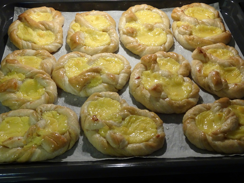 Puderzucker mit etwas Wasser verrühren und auf die noch heißen Teilchen pinseln. Ich pinsel auch etwas Guss auf den Pudding, weil ich das von den gekauften Teilchen so kenne. Aber es reicht auch, wenn der Teigrand eingepinselt wird, das kann jeder nach seinem Geschmack machen.