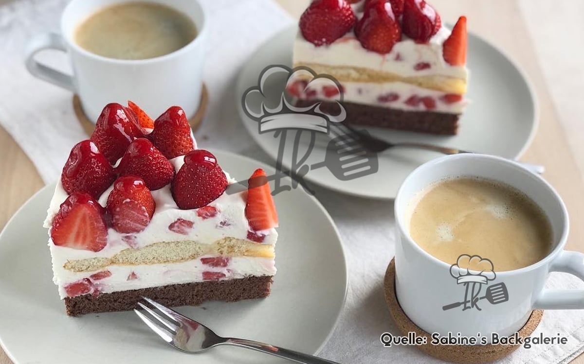 Erdbeeren waschen und die Hälfte würfeln. Gelatine nach Anleitung einweichen. Sahne steif schlagen. Quark, Mascarpone, Zucker und Vanillezucker verrühren. Biskuit aus der Form lösen und einen Tortenring um den Biskuit legen. Die Löffelbiskuits mit dem Orangensaft beträufeln. Gelatine ausdrücken und bei schwacher Hitze auflösen. Ca. 2-3 EL Mascarpone Creme in die aufgelöste Gelatine einrühren und dann unter die übrige Creme rühren. Erst Sahne und dann die Erdbeerwürfel vorsichtig unterheben. Hälfte der Creme auf dem Biskuit verteilen. Löffelbiskuits dadrauf verteilen (evt. zuschneiden) Rest Creme dadrauf streichen. Die ganzen Erdbeeren obendrauf setzen und leicht andrücken. Über Nacht kalt stellen. Tortenring lösen. Die Konfitüre erwärmen und die Erdbeeren damit bestreichen.