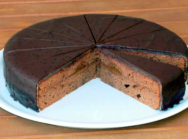Sachertorte mit Aprikosenfüllung, Marzipandecke und Schokoladen-Glasur