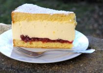 Mein Tipp: Wenn man den Kuchen nach dem gesamten Backvorgang kurz abkühlen lässt (ca. 5 Minuten) und dann eine Abdeckhaube darüberstülpt, entstehen kleine goldgelbe Zucker-Wasser-Kügelchen auf dem Baiser. Das ist eine schöne Dekoration.