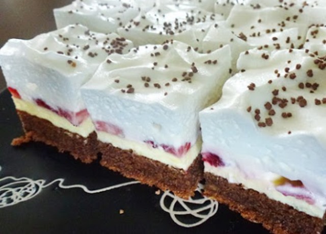 Die Creme auf dem kalten Kuchen verstreichen und mit klein geschnittenen Erdbeeren belegen. Sahne mit Sahnesteif steif schlagen und den Kuchen damit verzieren. Den Kuchen in den Kühlschrank stellen, am besten über Nacht. Danach in Stücke schneiden und servieren