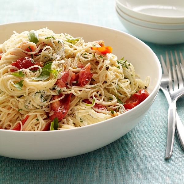 Währendessen einen großen Topf mit gesalzenem Wasser zum Kochen bringen. Pasta hineigeben und nach Packungsanweisung al dente kochen. Abtropfen lassen und in eine große Schüssel geben. Tomatenmischung untermengen. Kräuter und Schafskäse unterheben und mit Salz und Pfeffer würzen.