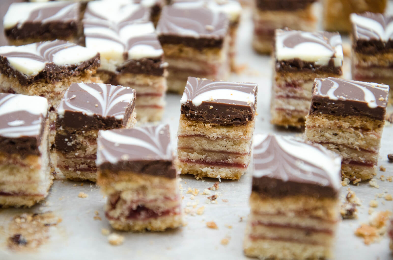 4) Die Schokolade über heißem Wasserbad schmelzen und mit dem Kokosfett gut verrühren. Über den ausgekühlten Mürbteig streichen und mit weißer Schokolade oder Nüssen bestreuen. Auskühlen lassen und in kleine Quadrate schneiden.