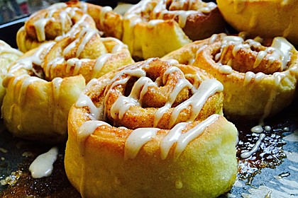 Dieses Rezept ist den amerikanischen „Cinnabon Rolls“ nachempfunden und ergibt ca. 25 Zimtschnecken. Diese sind höher und weicher als deutsche Zimtschnecken. Auch ähneln sie eher einem Schneckenkuchen, von dem die einzelnen Schnecken dann abgetrennt werden